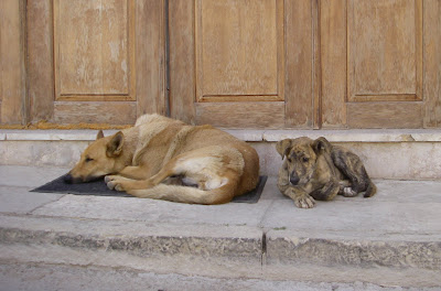Puis, nous sommes arrivés au marché couvert. On y trouve quelques stands à destination des habitants de Chania comme cette boucherie dans laquelle veillent quelques habitants à quatre pattes…