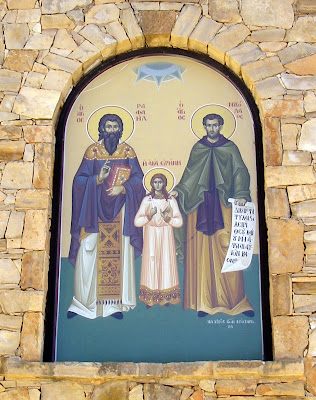 Nous étions juste après Pâques, les encensoirs et chandeliers étaient sortis. Devant les portraits des saints, de multiples médailles votives étaient accrochées. Ici, à Chania :