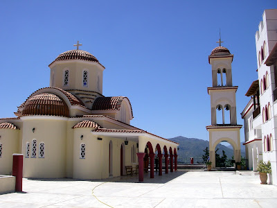Le clocher est dans un bâtiment à part de l’église. On le voit bien ici dans la grosse église de Spili :