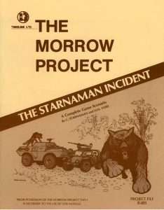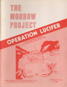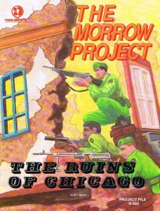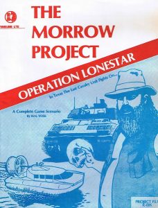 The Morrow Project fait partie des JdR que je classe dans la catégorie « post-cataclysmique sérieux » (par opposition aux JdR « post-cataclysmique gonzo », avec des mutations loufoques et autres, dont le chef de file est Gamma World mais dont on pourrait (hélas ?) citer beaucoup d’autres exemples, et aux JdR « post-cataclysmique pas sérieux » comme Bitume) ; catégorie dont le représentant principal est Aftermath! (qui finira probablement par avoir les honneurs de la présente rubrique, mais pour l’instant je me le garde pour la fois où je serai tellement à la bourre et peu inspiré qu’il me faudra me rabattre en catastrophe sur une telle valeur sûre dont je pourrais parler sans avoir besoin d’aller me replonger dans les bouquins).