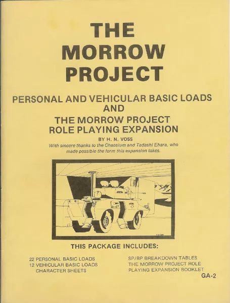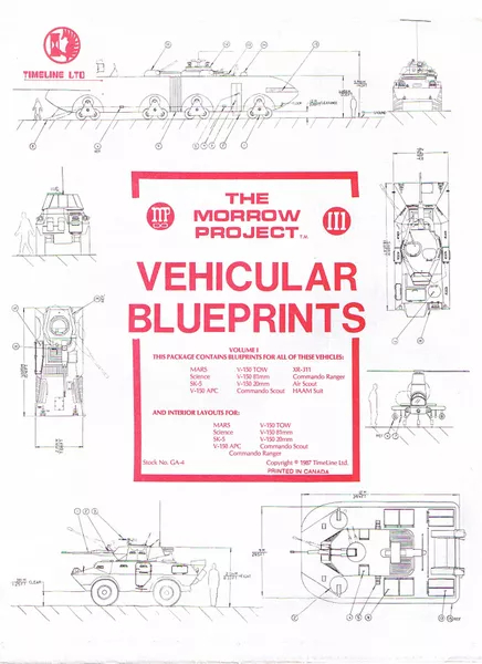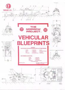 Au-delà du livre de base, The Morrow Project dispose d’une petite gamme, principalement constituée de scénarios. Outre ces scénarios, il y a eu : deux écrans (un Game Master’s Shield pour les deux premières éditions, que l’on voit en photo dans l’article de J&S (avec une illustration plutôt pas terrible, censée je présume représenter un champignon nucléaire, mais dont l’examen de la photo dans J&S me plongeait à l’époque dans des abîmes de perplexité, car j’y voyais plutôt la tête portant une casquette d’un poussin anthropomorphe de dessin animé), et un Project Director’s Screen pour la troisième, qui manque encore à ma collec’, mais en principe plus pour très longtemps) ; Personal and Vehicular Basic Loads, dont il existe au moins deux versions et qui propose des listes standard de matos et la role playing expansion qui sera ensuite intégrée à la troisième édition) ; et Vehicular Blueprints, un recueil de plans et de schémas techniques des principaux véhicules du Projet.