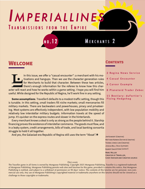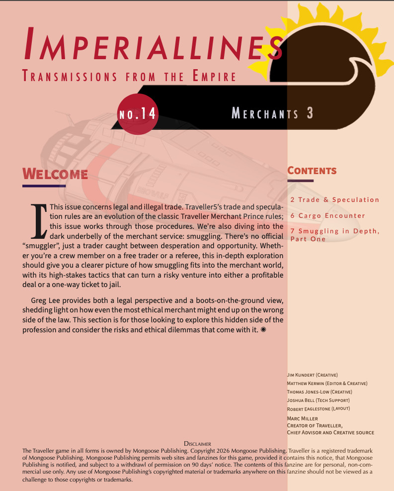 Le numéro 14 contient des compléments et des précisions sur les règles de commerce interstellaire de T5, une créature, et un chapitre sur la contrebande.